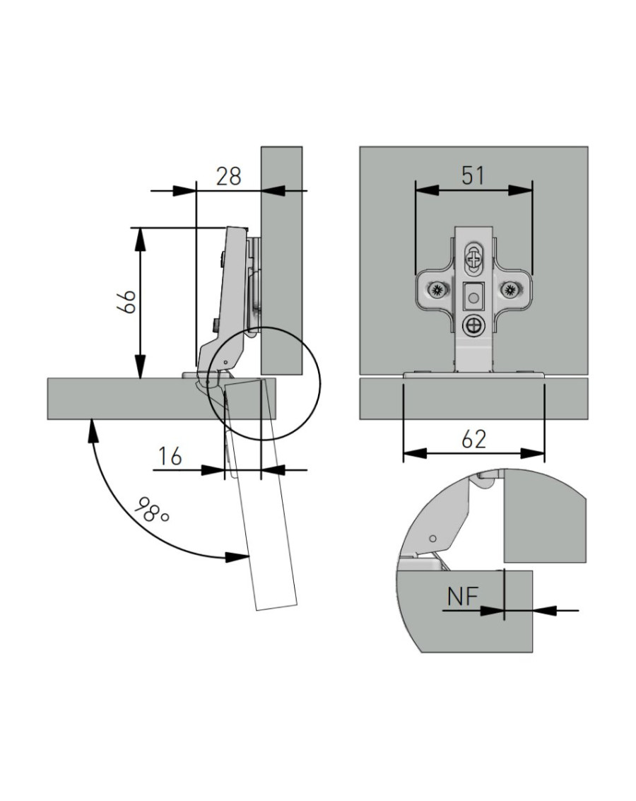Петля имеет универсальное применение и подходит для различных мебельных систем. Простота монтажа достигается за счёт зажимной цепи и возможности регулировки в трёх плоскостях. Изделие соответствует европейскому стандарту PN-EN 15570:2010 / EN 15570:2008, что гарантирует его долговечность и высокое качество.