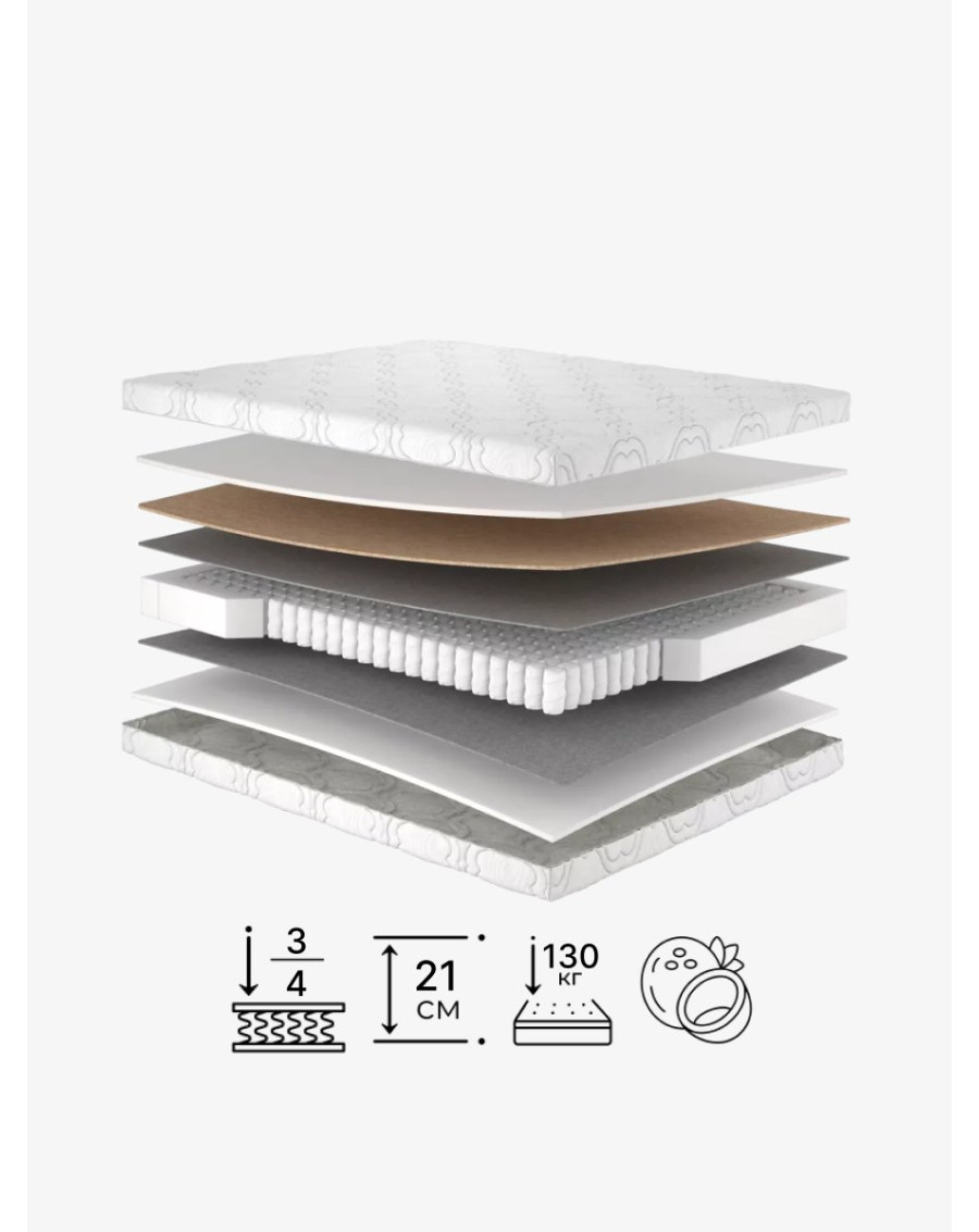 - Кокосовая койра — натуральный слой для дополнительной жёсткости и вентиляции.