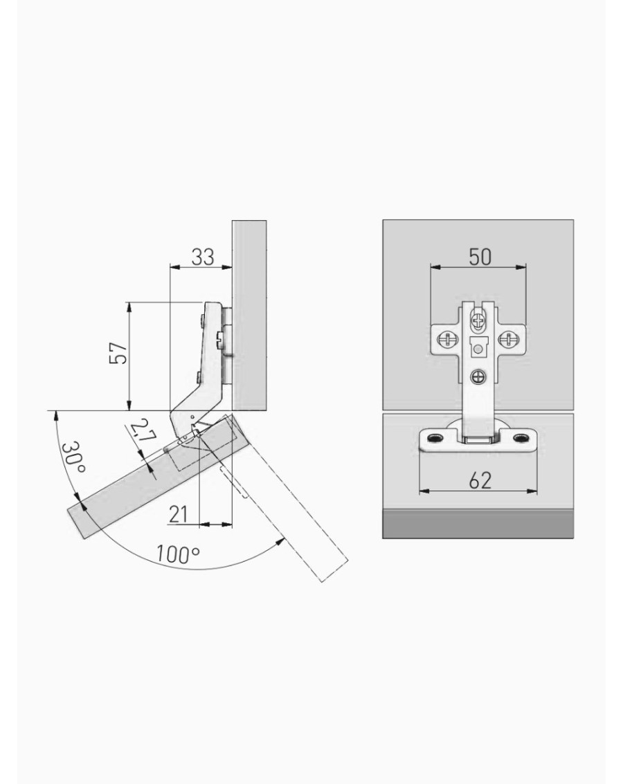 Шарнир оснащен механизмом закрытия на пружине и цепи скольжения, что обеспечивает плавное и контролируемое движение фасада. Благодаря двухступенчатой работе шарнира последняя фаза открытия проходит мягко, что защищает фасад от ударов о стену или соседнюю мебель.