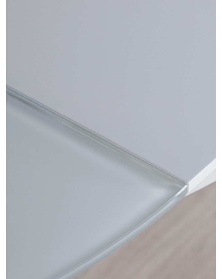 Столешница из закаленного матового стекла с элементами МДФ сочетает прочность, практичность и аккуратный внешний вид. Поверхность устойчива к повседневным нагрузкам и проста в уходе. Центральная опора из алюминия отличается необычной формой и становится эффектным акцентом интерьера.