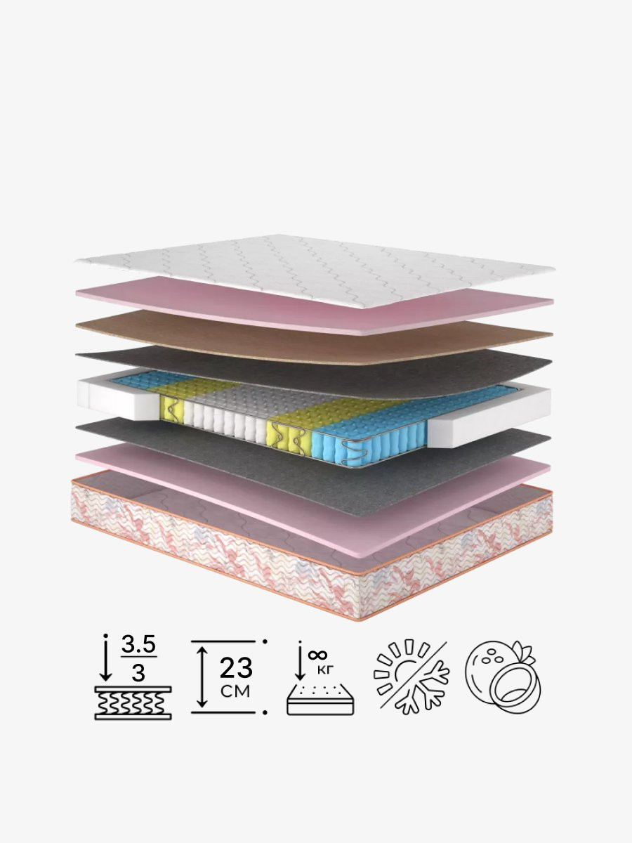 Благодаря усиленной конструкции края матраса устойчивы к деформации, а сам пружинный блок выдерживает интенсивные нагрузки и сохраняет форму на протяжении всего срока эксплуатации.