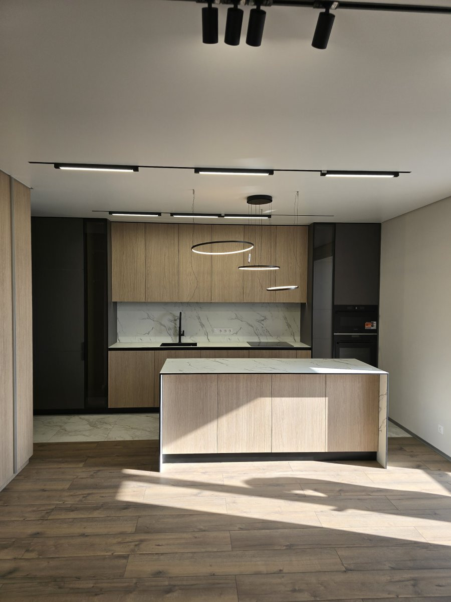 Современная линейная кухня с островом — стильное и функциональное решение для квартиры-студии в новом жилом комплексе. Дизайн построен на контрасте тёмно-серых пеналов и фасадов с текстурой натурального дерева, что создаёт уютную и одновременно минималистичную атмосферу.