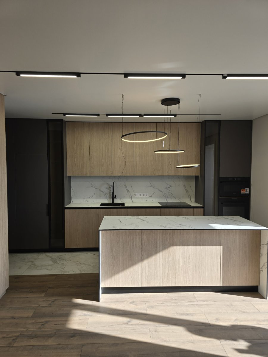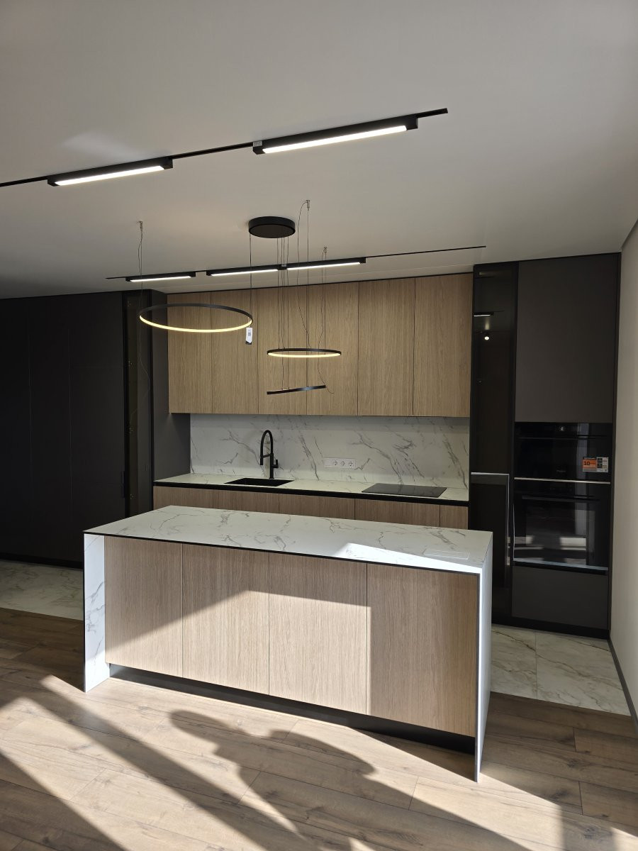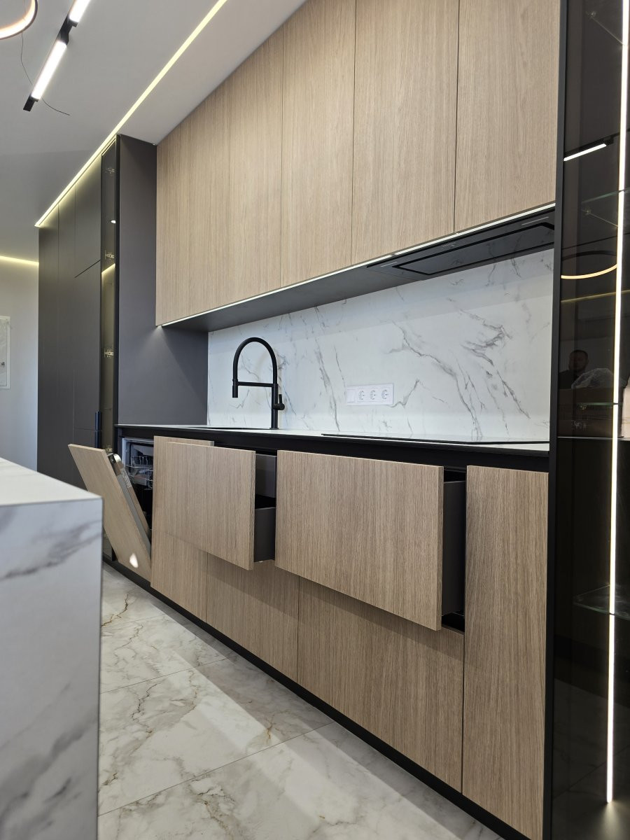 Рабочая зона дополнена столешницей из компакт-плиты с декором под белый мрамор с серыми прожилками — практичное и износостойкое решение для ежедневного использования. Вся техника интегрирована и скрыта за фасадами, что сохраняет чистоту линий и современный внешний вид кухни.