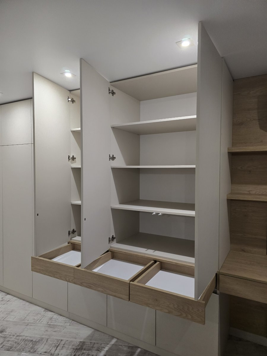 Фасады выполнены из ЛДСП в сочетании светлых оттенков с декором под дерево, что добавляет пространству тепла и уюта. Открывание реализовано с помощью системы «push-to-open», что позволяет полностью отказаться от ручек и подчеркивает современный стиль мебели.