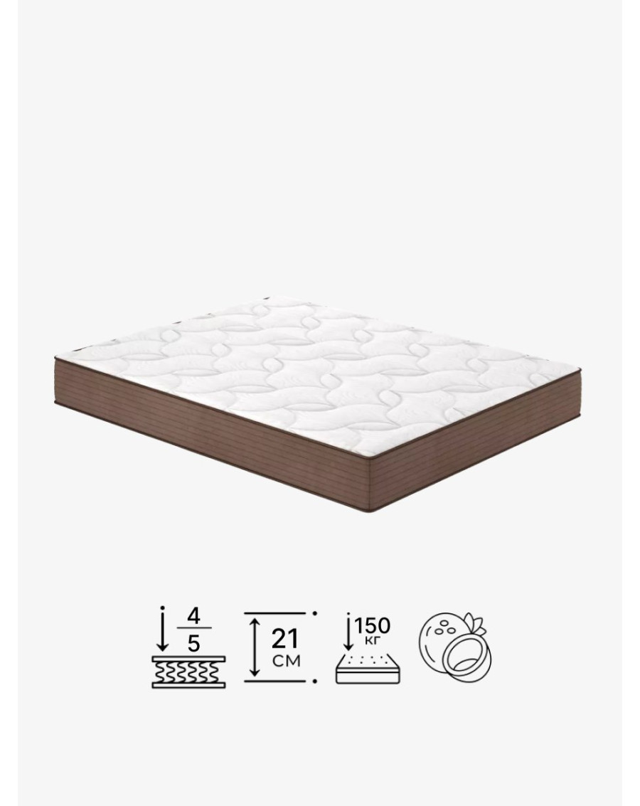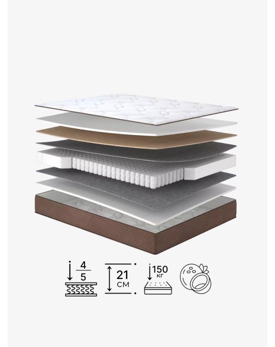 В основі — пружинний блок Pocket Spring Hard, який забезпечує рівномірний розподіл навантаження та анатомічну точність. Шари кокосової койри та ортопедичної піни роблять поверхню пружною та стійкою до деформацій, а Thermofiber захищає м'які матеріали та продовжує термін служби виробу.