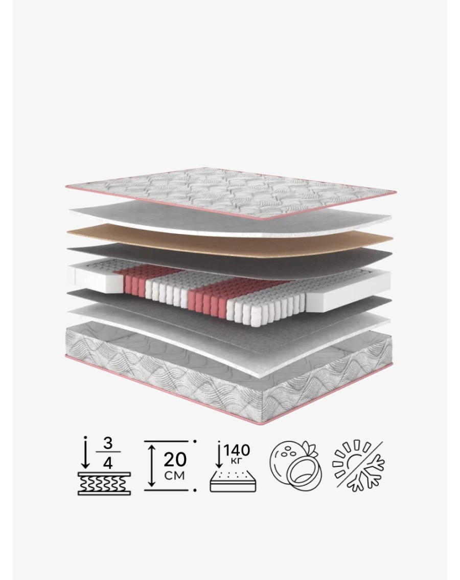 В основі - 5-зонний блок Pocket Spring, який підлаштовується під анатомію тіла, підтримує хребет та забезпечує розслаблення м'язів. Шари кокосової койри, Be-fiber та Thermofiber створюють баланс пружності, довговічності та ортопедичного ефекту.