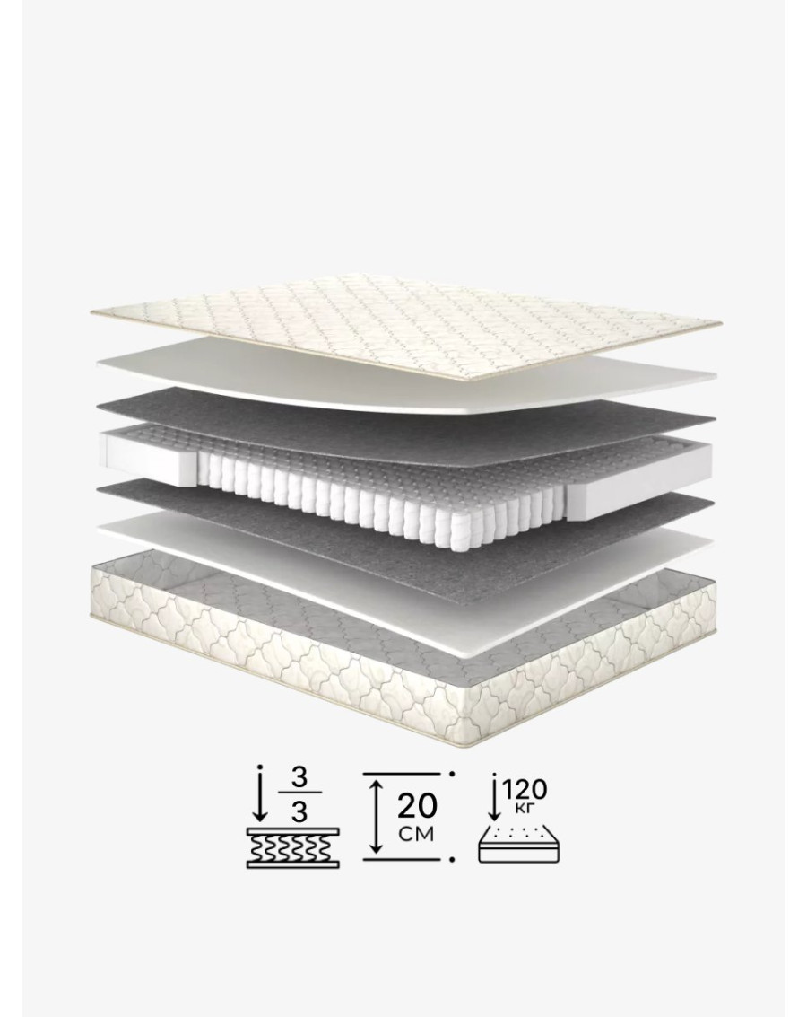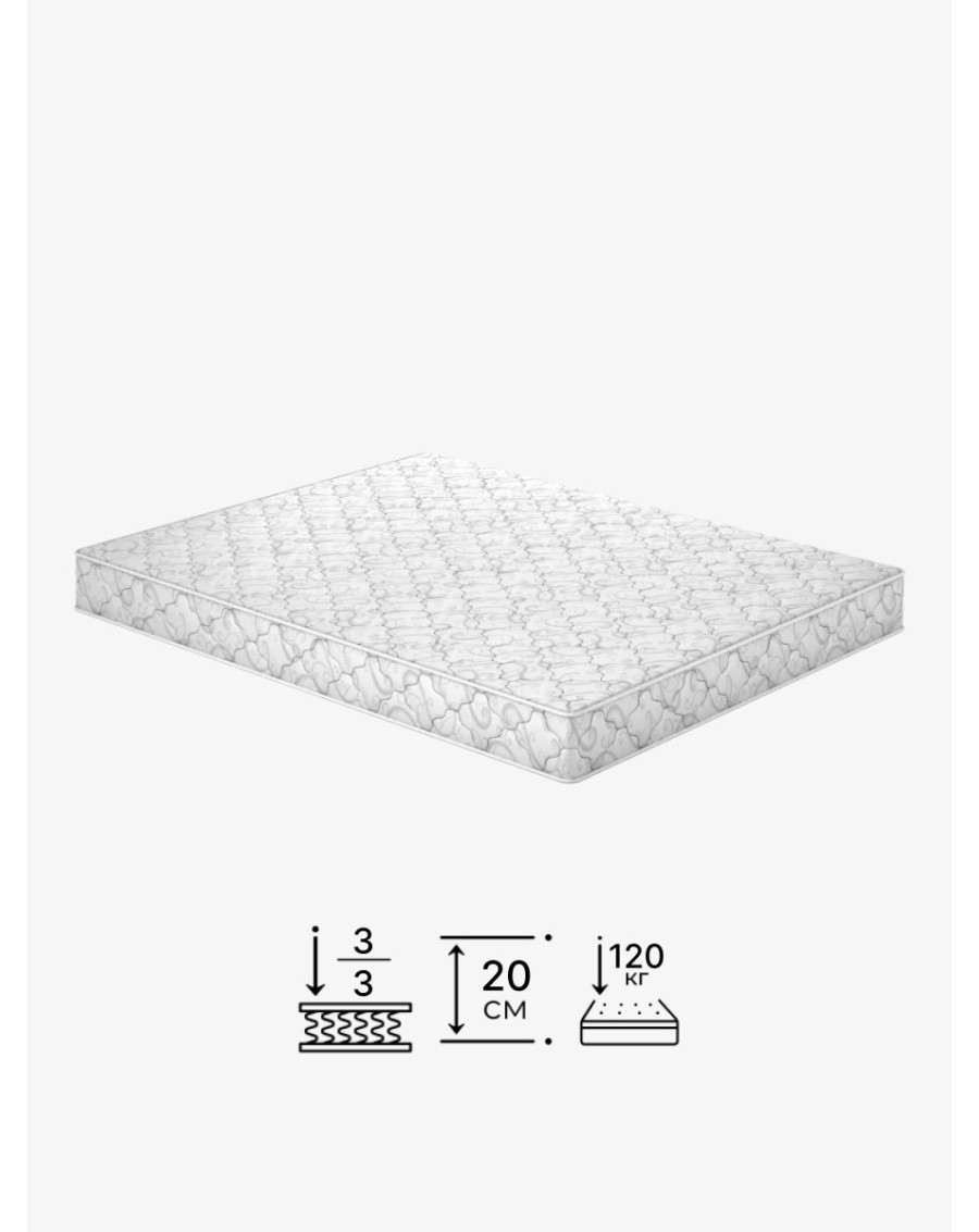 Висота моделі — 20 см, а допустиме навантаження — до 120 кг на одне спальне місце. Матрац забезпечує комфортну підтримку тіла та сприяє повноцінному відпочинку.