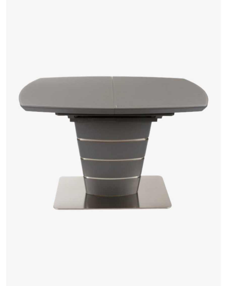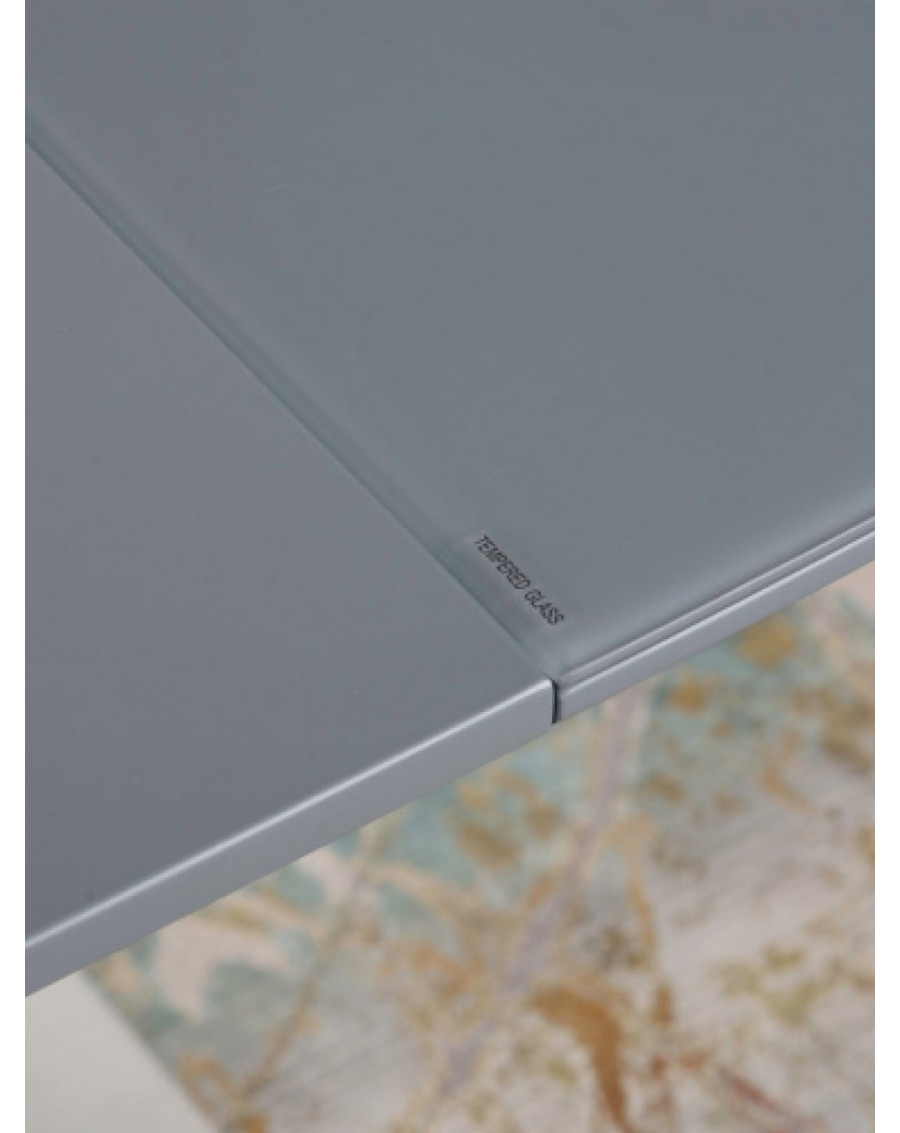 Опора столу декорована вставками з нержавіючої сталі, що додає виробу елегантності та підкреслює його дизайн. Стільниця з сатинового скла у поєднанні з МДФ вирізняється практичністю, зносостійкістю та простотою догляду.