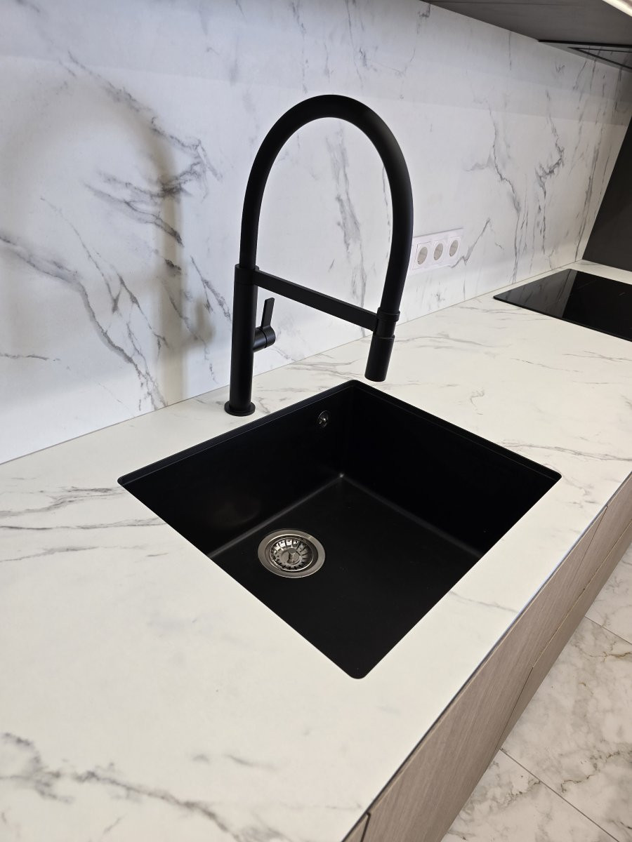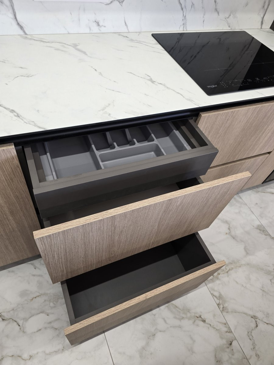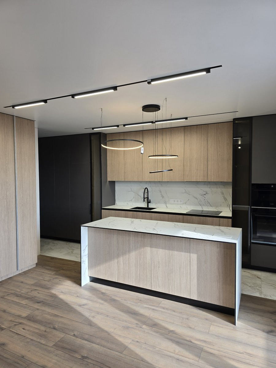 Робоча зона доповнена стільницею з компакт-плити з декором під білий мармур із сірими прожилками — практичне та зносостійке рішення для щоденного використання. Вся техніка інтегрована та прихована за фасадами, що забезпечує чистоту ліній і сучасний вигляд кухні.