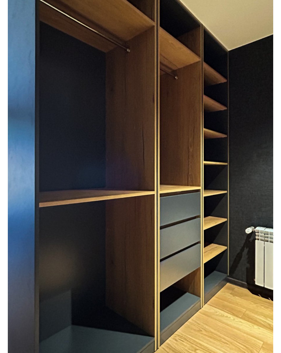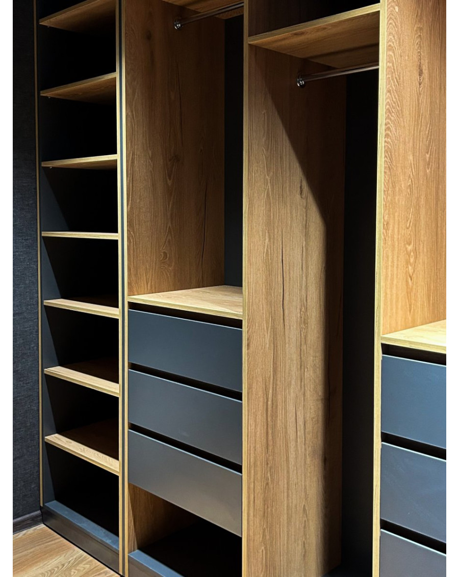 Індивідуальний проєкт гардеробної кімнати, виготовлений на замовлення у графітовому кольорі з теплими дерев’яними акцентами, створює спокійний, сучасний та візуально глибокий інтер’єр.