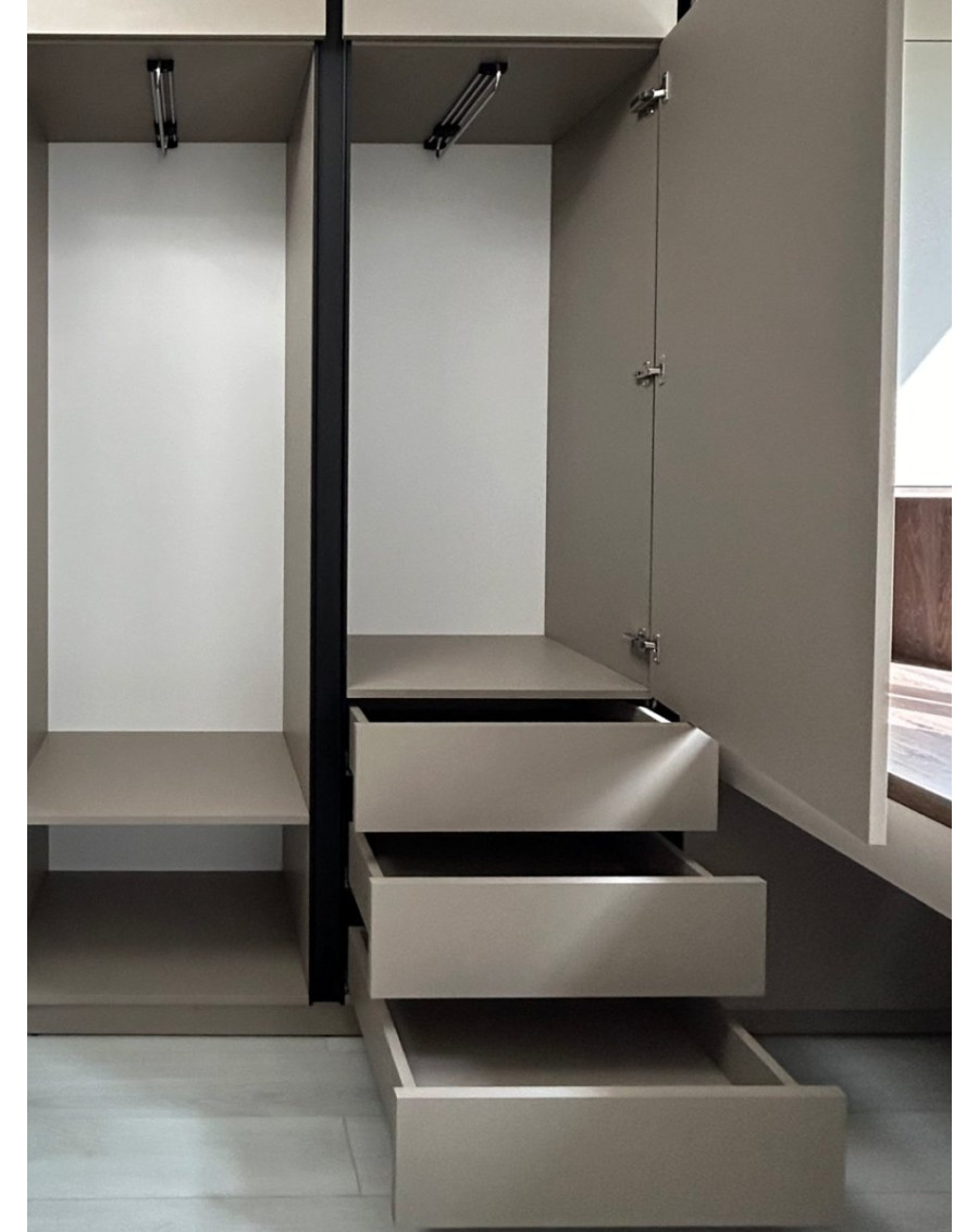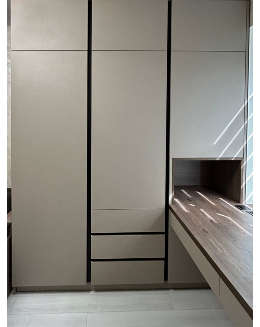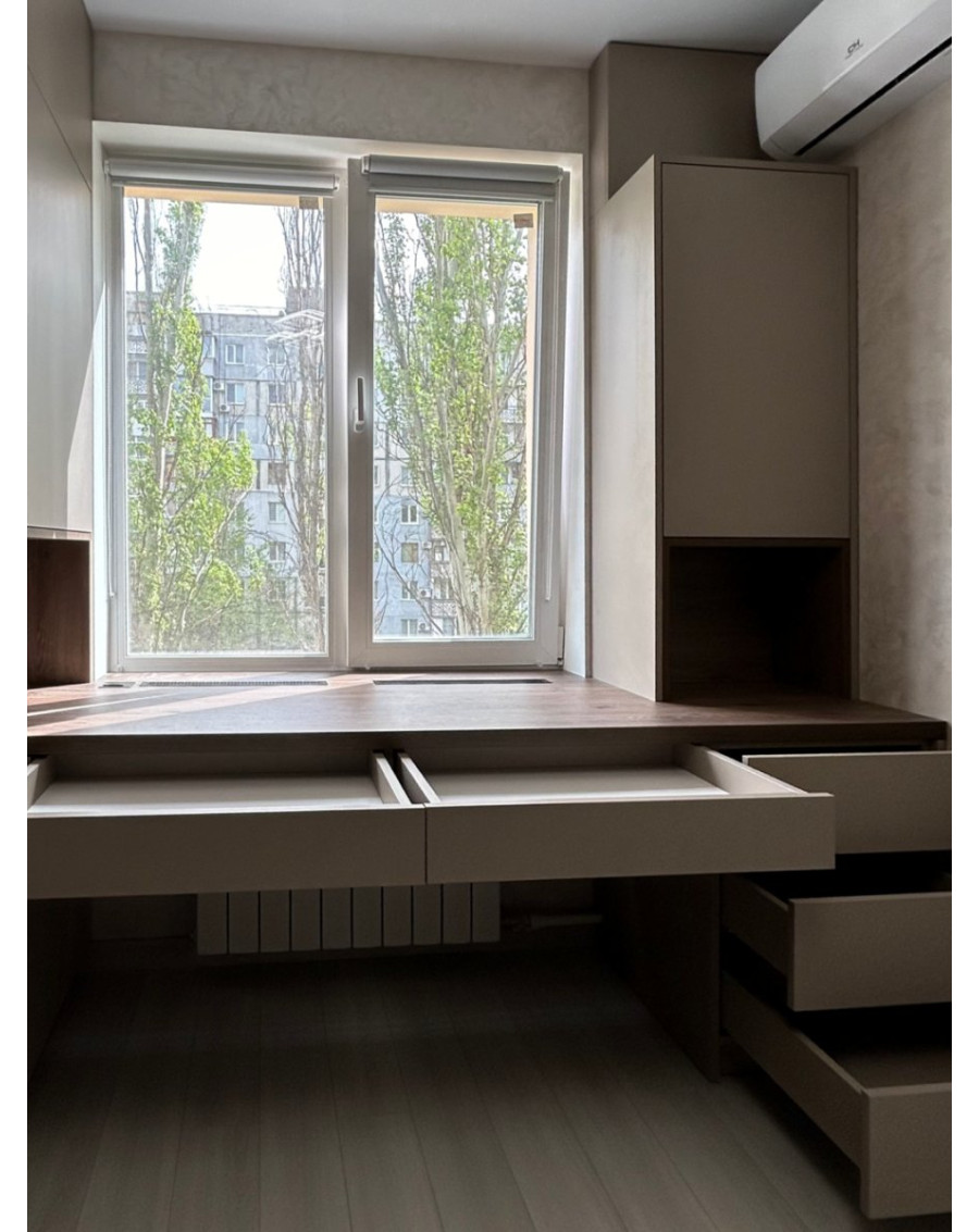 Клієнт хотів створити робоче місце, що максимально використовує простір біля вікна.При цьому забезпечити достатню кількість місця для зберігання документів та особистих речей. І, звичайно, гармонійно вписати в загальний простір.